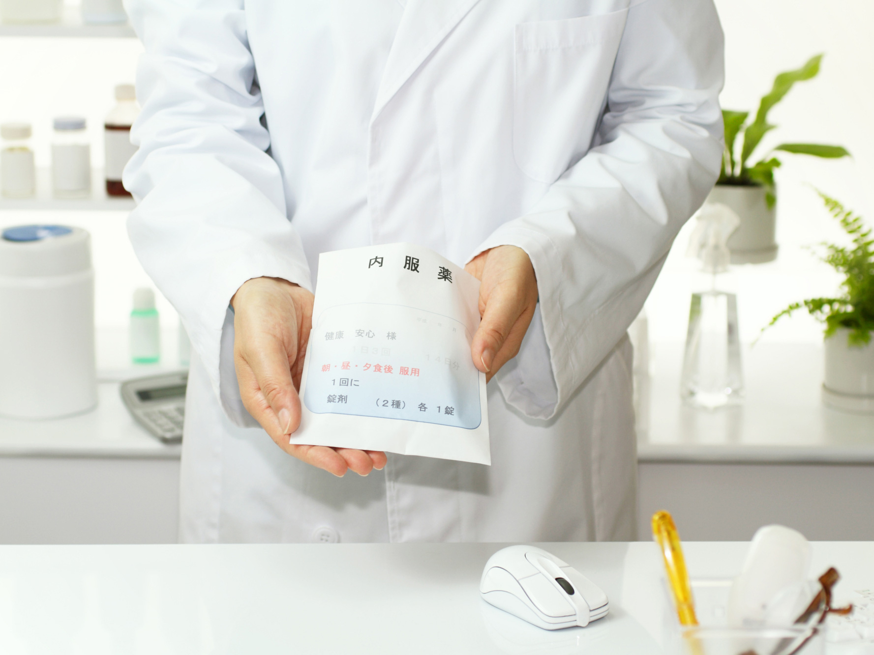 当薬局では、お持ちになった処方せんから、専門知識を持つ薬剤師が薬の量や飲み合わせに間違いがないか確認した上で、正確に調剤します。